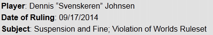Dennis “Svenskeren” Johnsen将会受到:1)总决赛前三场比赛禁赛;2)2500美金罚款